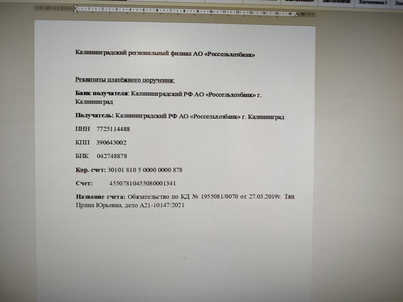 Претендент (Заявитель) обязан указать в платежном документе в графе «назначение платежа» - «Задаток за участие в торгах № ___ (указать номер торгов) по лоту № ____ (указать номер лота) по продаже имущества (указать наименование и должника)».