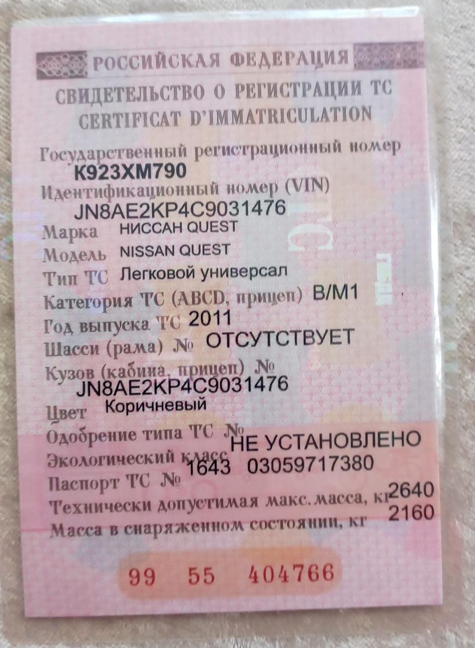 Автомобиль марки НИССАН модель QUEST 2011 г.в. VIN-номер JN8AE2KP4C9031476