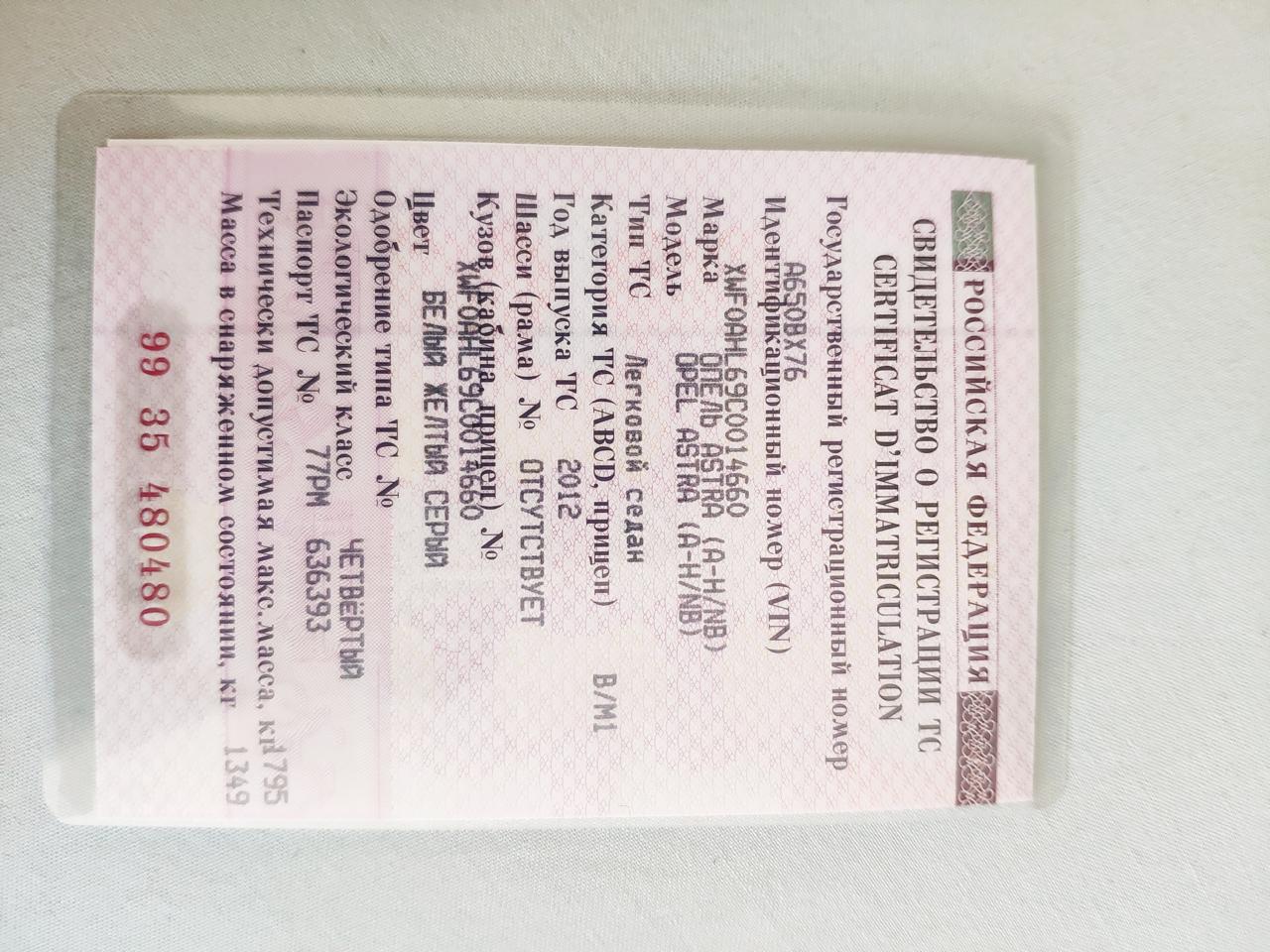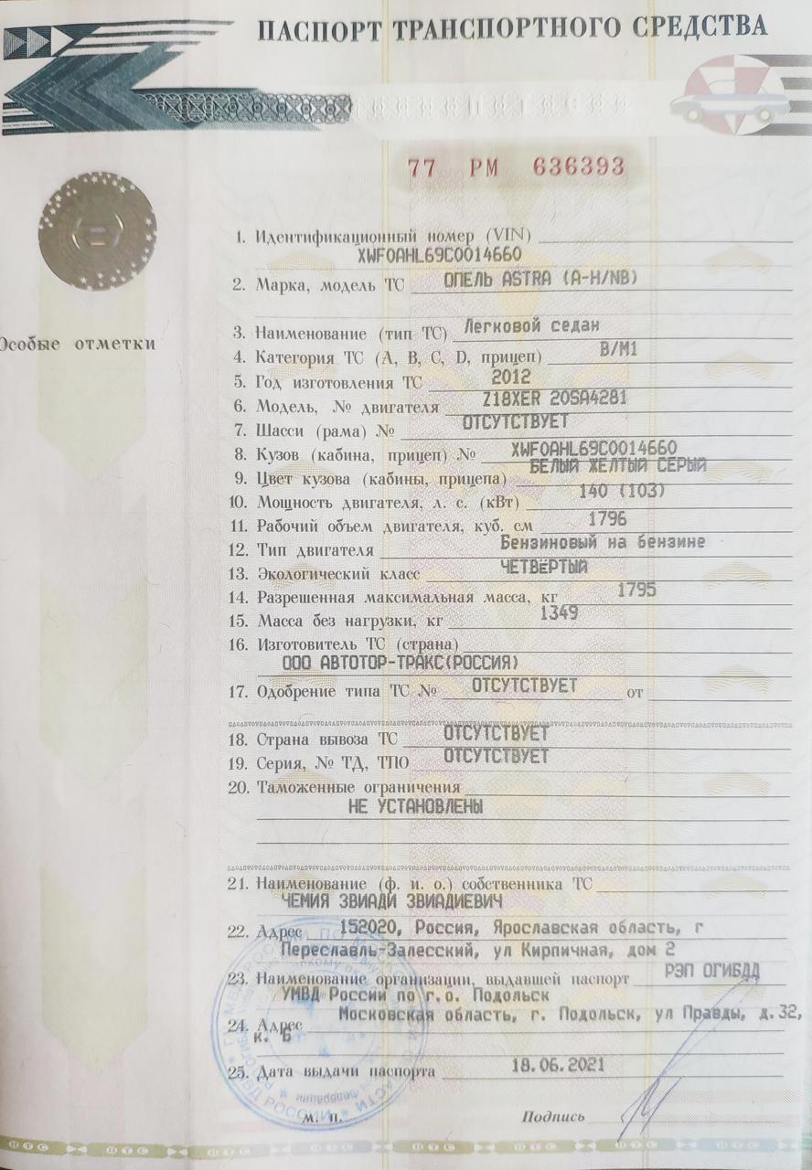 Легковой автомобиль OPEL, модель: Astra (A-H\NB), год выпуска: 2012 г., кузов №:XWF0AHL69C0014660, идентификационный номер (VIN): XWF0AHL69C0014660.